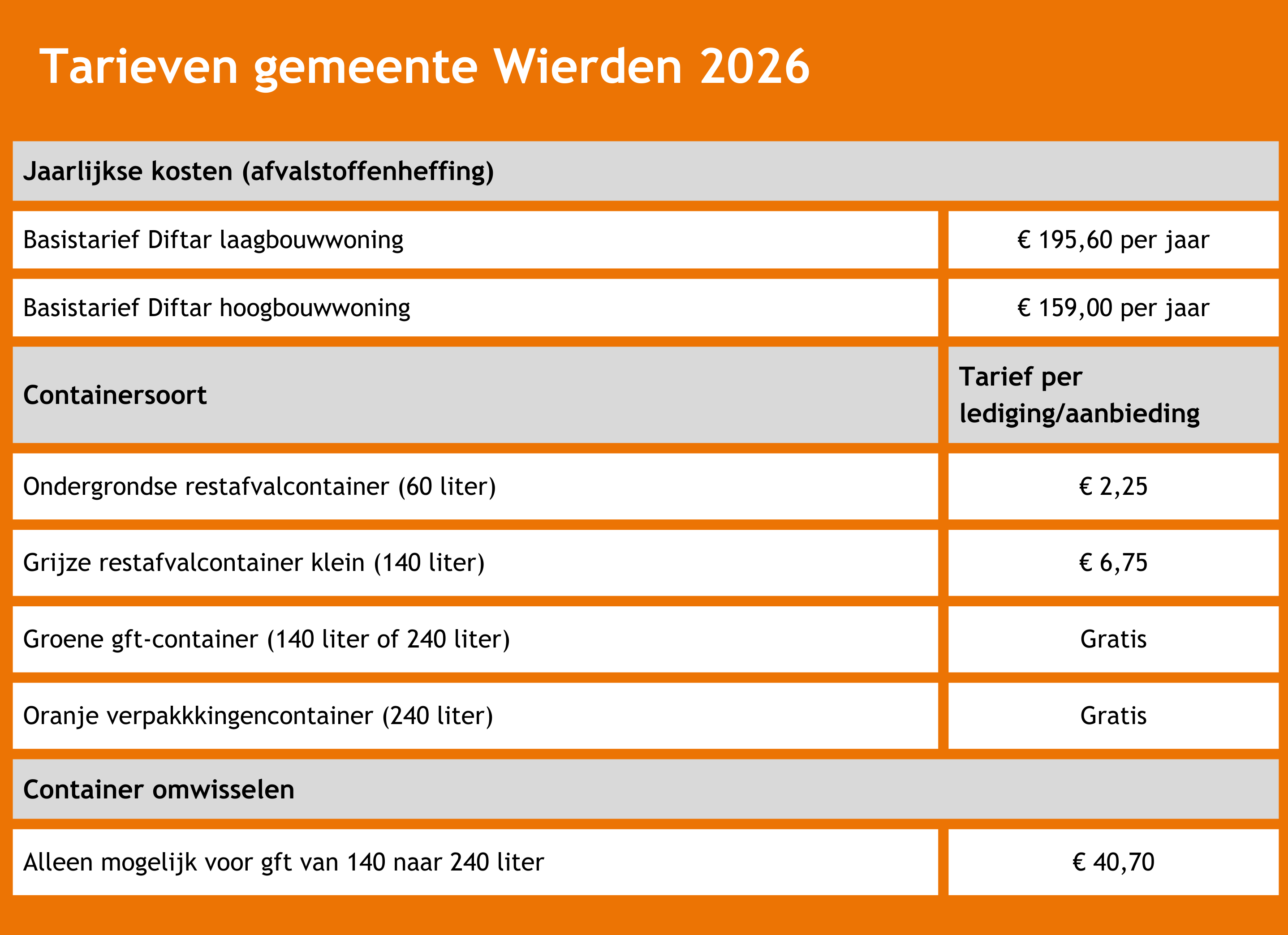 Elke inwoner van Wierden betaalt afvalstoffenheffing, ook als u weinig of geen huishoudelijk afval aanbiedt. De gemeente Wierden kent een vast en een variabel tarief. Er is een vast tarief voor eenpersoonshuishoudens en meerpersoonshuishoudens. Het variabele tarief is voor het aantal keren dat u restafval aanbiedt. Dat wil zeggen: het aantal keren dat u uw grijze container aan de straat zet of een vuilniszak naar de verzamelcontainer voor restafval brengt. Dit systeem heet Diftar.